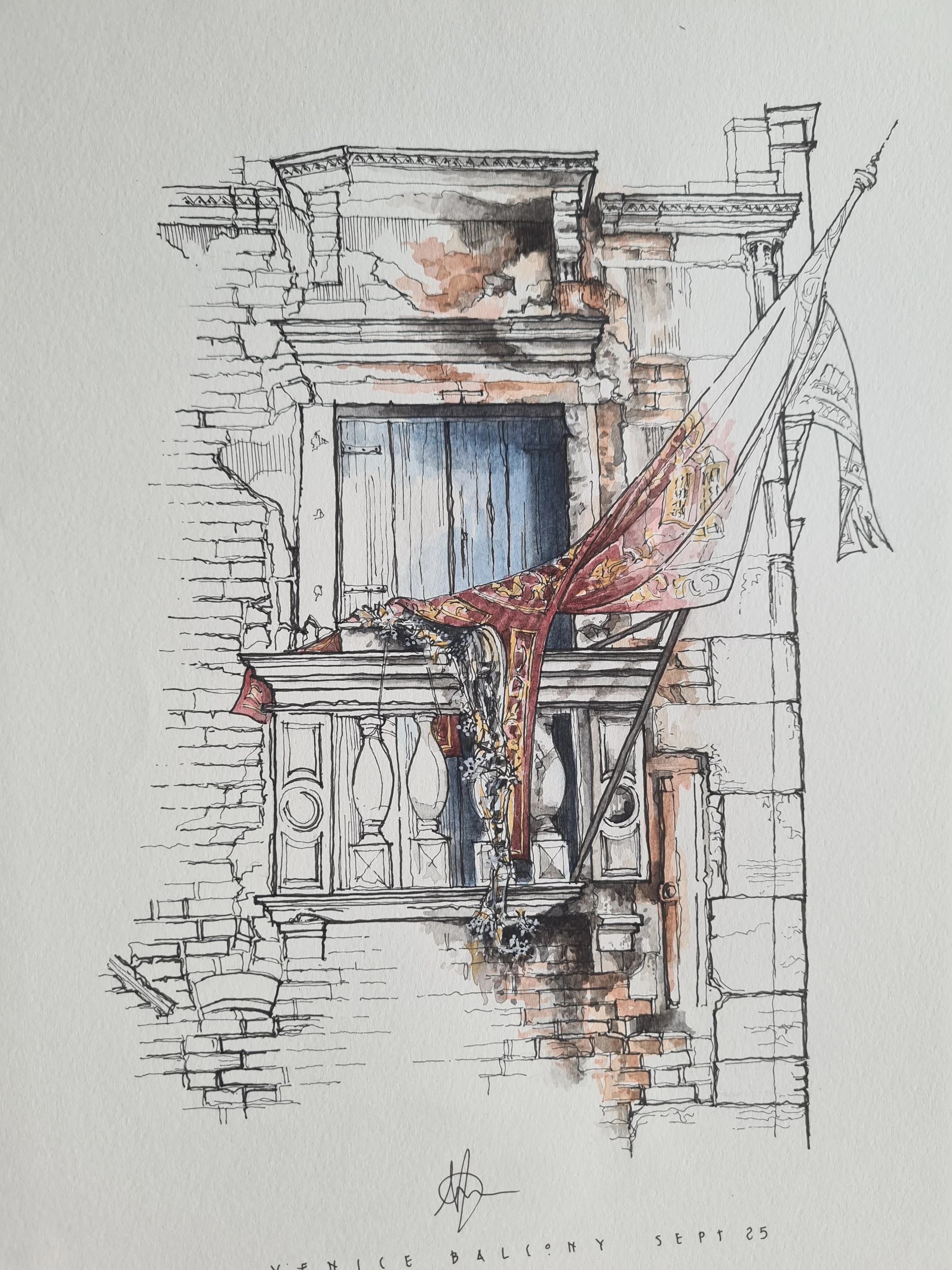 A glorious example of Venetian Decay - the flag of Venice draped over an old balcony